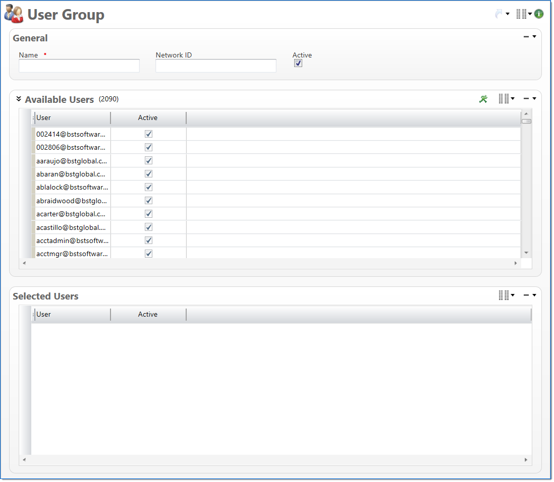 | Active | Select if the user group is active in the system. When this checkbox is not selected, the responsibility assignments are retained but will not work for users. | |